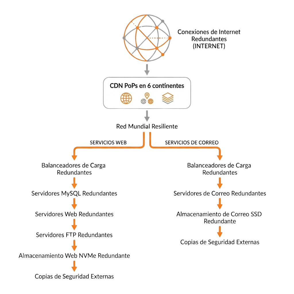 No es solo redundancia ante fallos: nuestro balanceo de carga global mantiene tu sitio rápido y estable incluso bajo cargas extremas de tráfico.